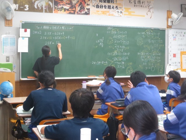 13数学では、間違いやすい方程式についての計算を確認しています。小数点や分数などが混じった方程式のポイントをみんなで確認しながら学習をすすめています。