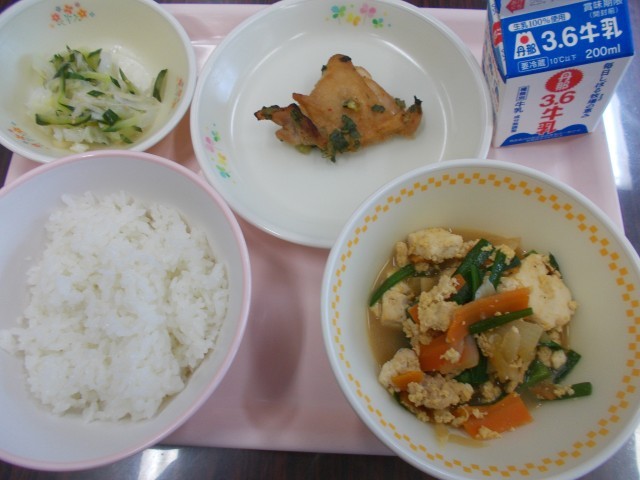ごはん 牛乳 鶏肉のビリ辛焼き たくあん和え 炒り豆腐