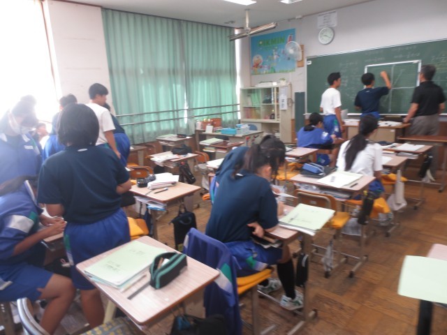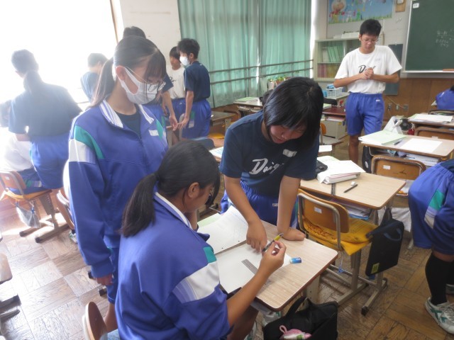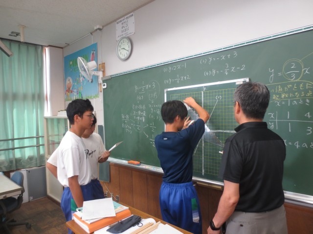 21数学では、一次関数について学習しています。一人でじっくり問題を解く生徒、話し合いながら問題を解く生徒、自分のスタイルに合った学習方法で解きすすめています。