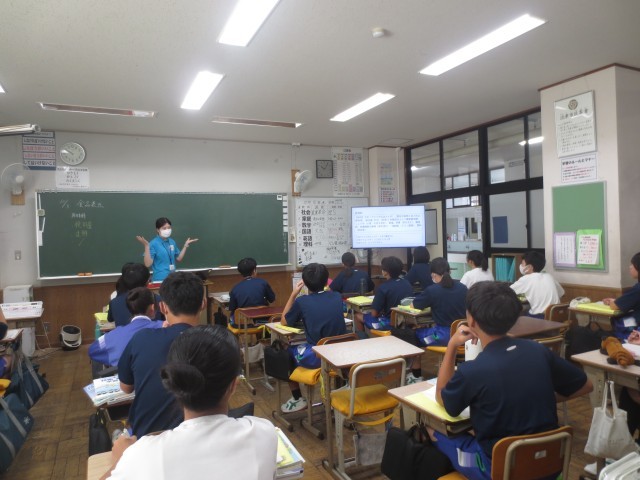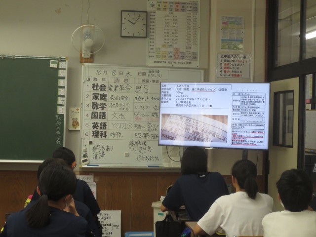 23家庭科では、食品表示でよく見かける遺伝子組み換えについて、遺伝子組み換えとはどのようなものなのか、身の回りにあることと結びつけながら考えています。