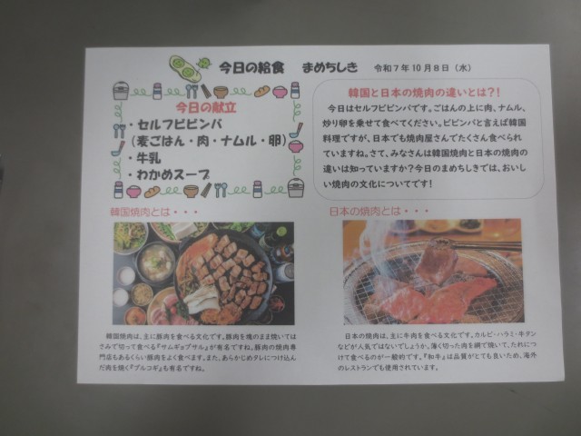 本日の給食は、セルフビビンバ(麦ごはん、肉、ナムル、炒り卵)牛乳、わかめスープです。韓国の味を美味しくいただきます。