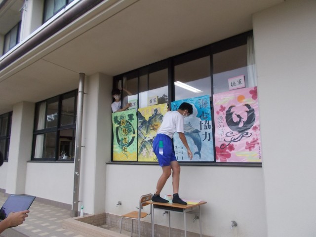 生徒みんなの手で、明日の体育の部に向けた準備を進めています。