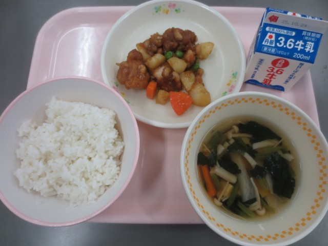 本日の給食は、ごはん、牛乳、鶏肉とじゃがいもの揚げ煮、豆腐とかまぼこのすまし汁です。おいしくいただきます。