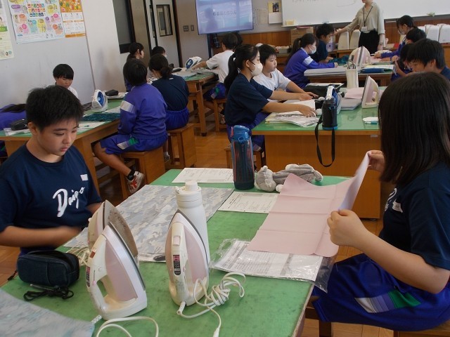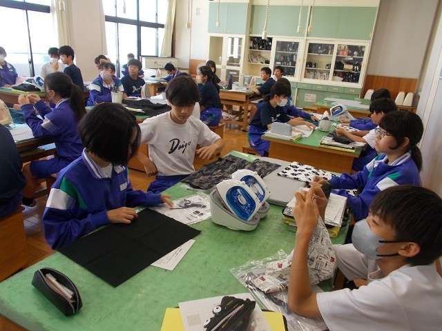 12の家庭は、巾着袋の作製にとりかかります。手順を聞いて、じっくり進めていきます。