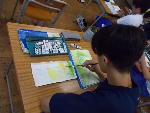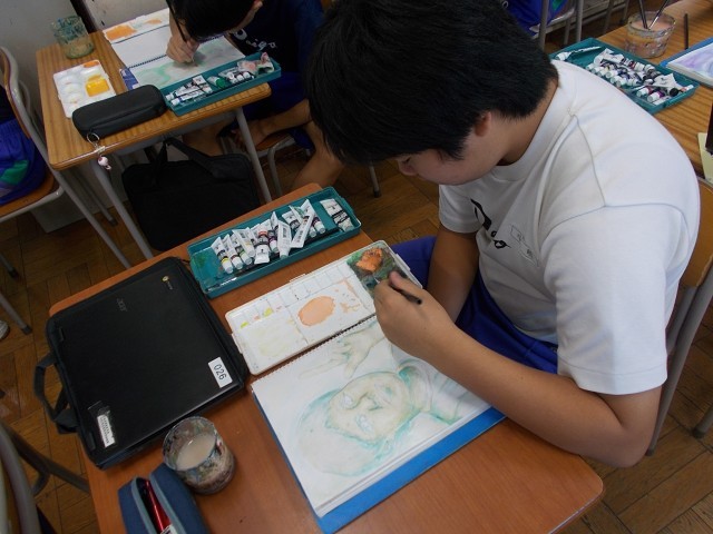33の美術は、自画像の彩色です。自分のイメージに合う濃淡・色は、どのような感じなのか、よく考えています。