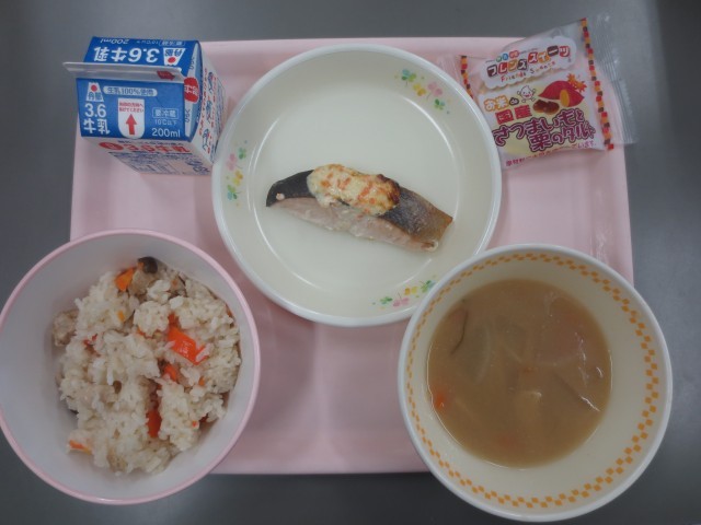 今日の給食は、あきの香りごはん、牛乳、鮭のもみじ焼き、すいとん汁、さつまいもと栗のタルトです。秋を感じながら、おいしくいただきます。