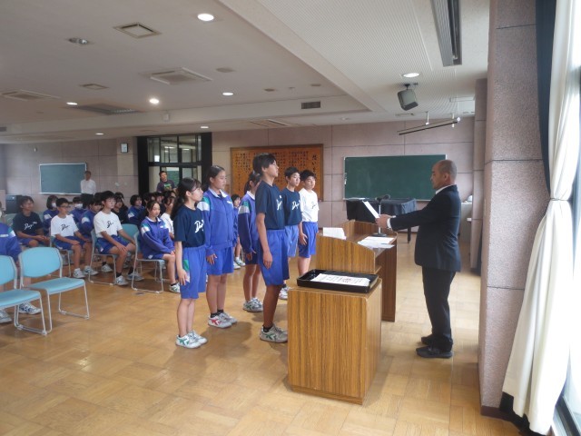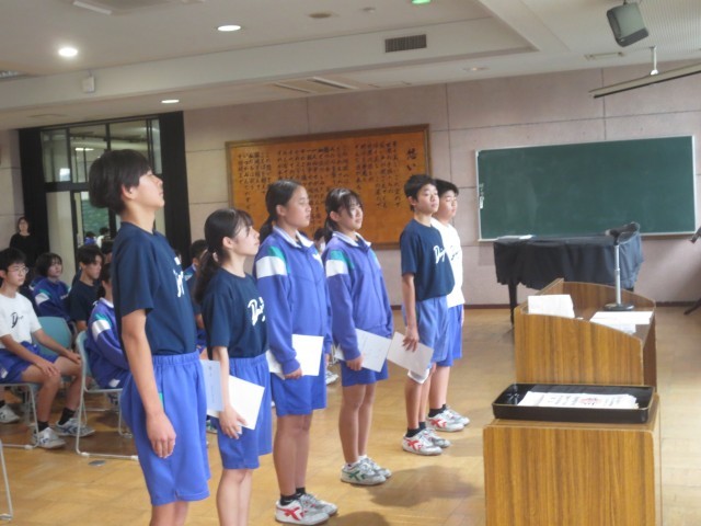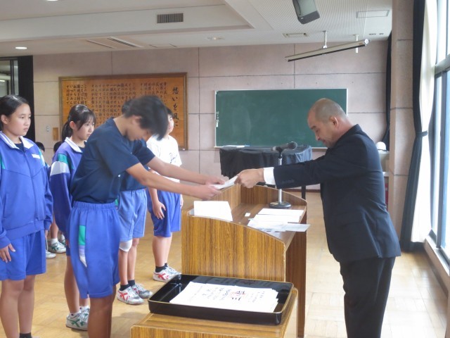 5時間目終了後、オンライン配信にて任命式と表彰を行いました。まずは、生徒会役員の任命です。校長先生から一人一人に任命状が手渡され、生徒たちは引き締まった表情で決意を新たにしていました。