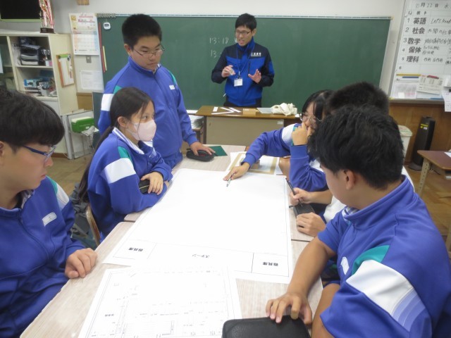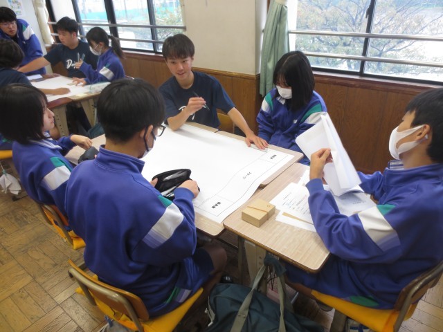 想定の状況を聞いて、第五中学校の避難所をどのように運営していくか、講師の先生のお話を聞きながらグループでイメージを膨らませています。