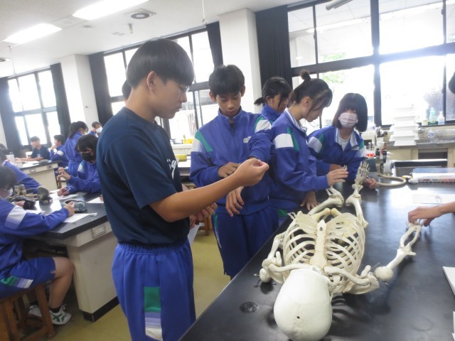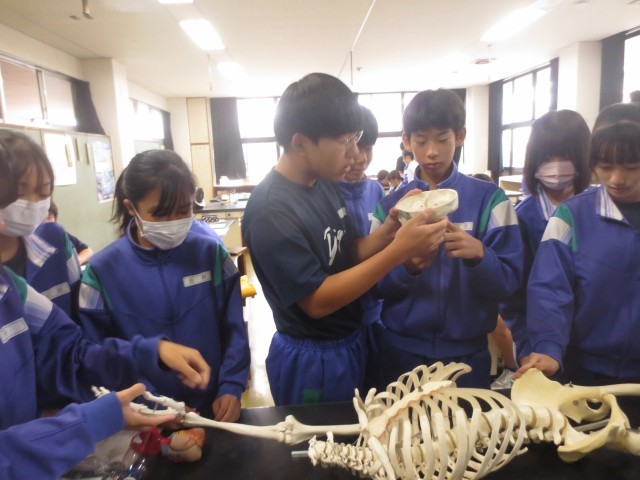24理科では、骨には、どんな役割があるか実際の人体模型を見ながらまとめています。