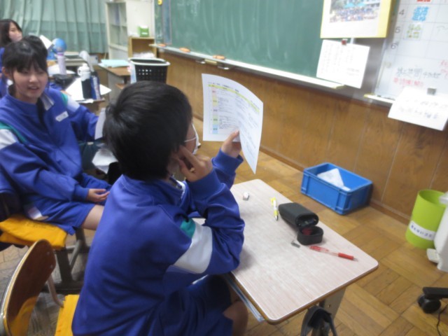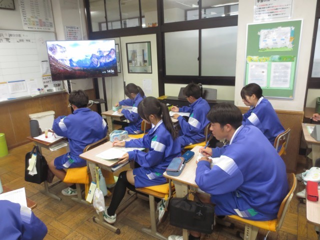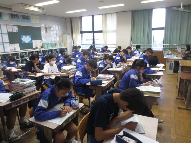 5時間目終了後のモジュール学活では、11月14日に行われる期末テストに向けて、テスト計画を立てています。範囲表とにらめっこしながら、どうしたら効率的にテスト勉強ができるか考えています。