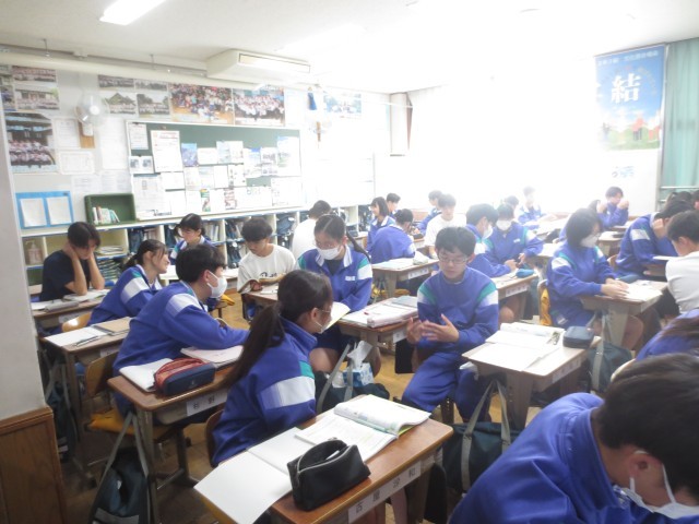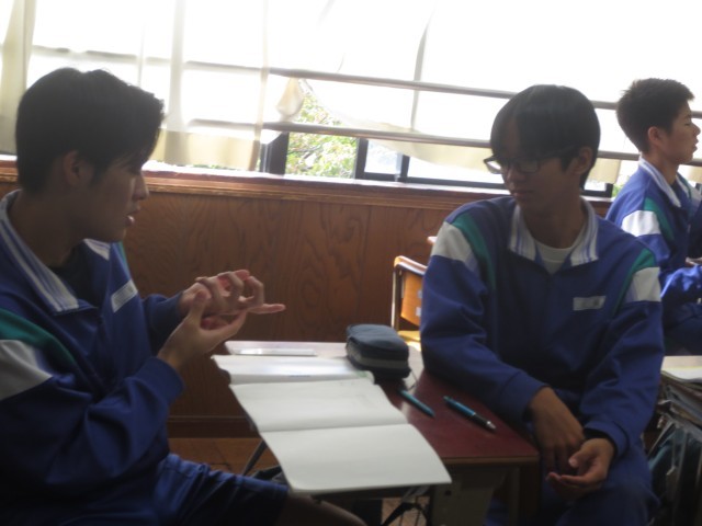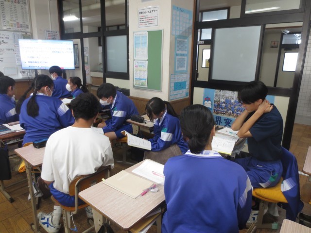 3-3数学では、相似について学習していました。相似を活用することによって、実生活にどのようにつながっているのかお互いに意見を出し合っていました。