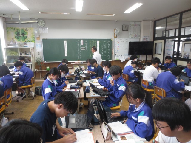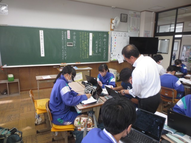 32国語では、奥の細道についてグループで学習しています。グループでも解決できないところは、先生のサポートを借りながら読み解いています。