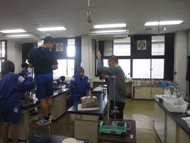 3-4理科では、動滑車を使用するのと、直接持ち上げるのとでは何が違うか、実際に実験を行っています。