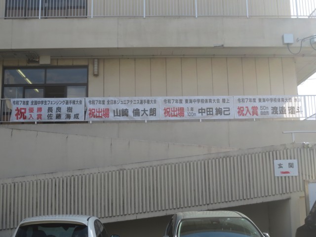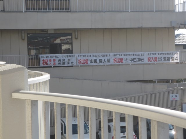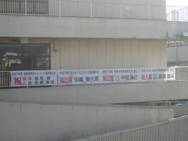 夏の大会で素晴らしい成績を収めたことを称える横断幕が完成しました。横断幕は職場体験をしている、3名の2年生の生徒に横断幕の設置とHP用の写真を撮ってもらいました。3枚の写真は、それぞれの生徒のお気に入りのアングルからの写真となります。ご来校の際には是非御覧ください。