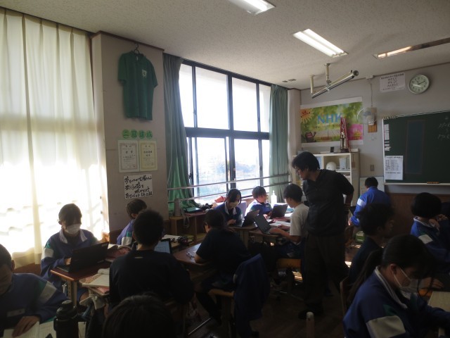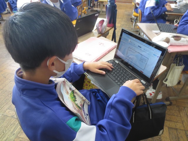 1-2国語では、物語の心情について教科書から読み取り、一人一台端末に書き込んでいます。物語に入りこんで、キーボードを打つ音だけが響きます。