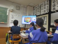 2-4英語では、単語の読みの練習が行われました。デジタル教科書を活用し、フラッシュカードを見ながら瞬時に英語の発音と意味を習得していきます。