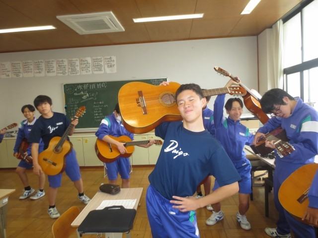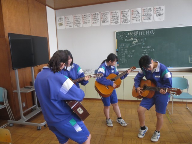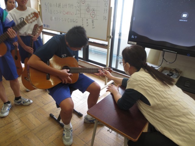 34音楽では、ギターで音階とコードを練習しています。素敵な音を出せるように、指を一生懸命動かしています。