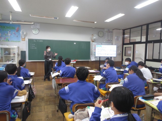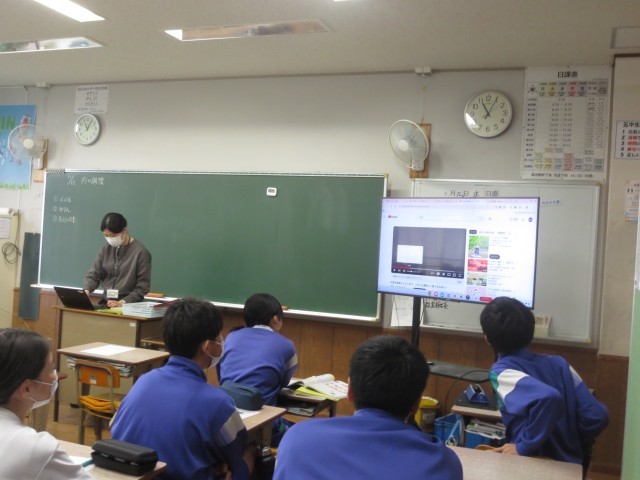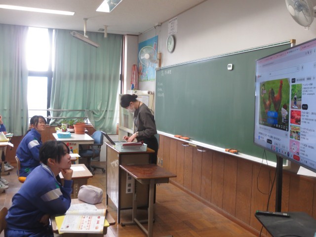 2-1家庭科では、生肉の取り扱いについて学んでいます。生のお肉をどのように処理すれば、安全に食べられるのか話し合いが行われています。