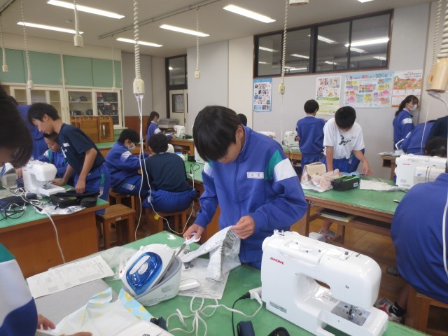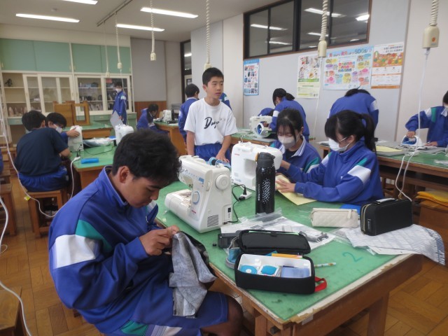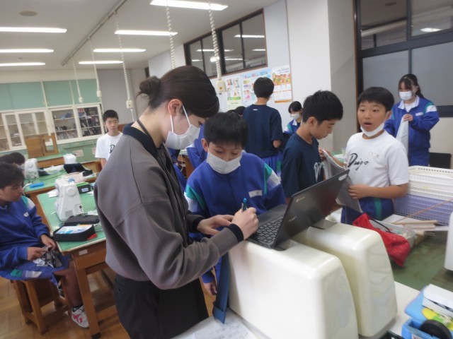 1-4家庭科では、ミシンを使って巾着袋を作っています。思い通りに、縫うことができているか、チェックポイントをみながら作成しています。