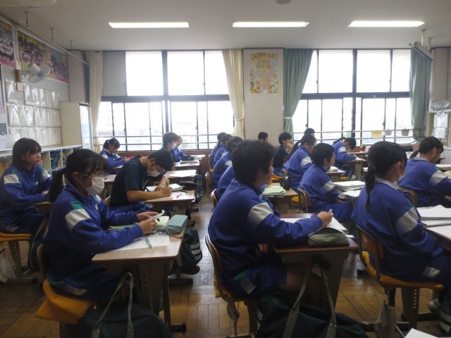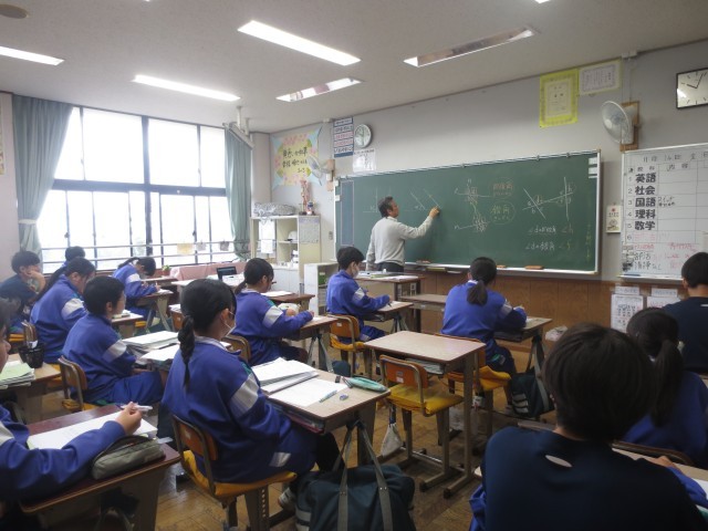 2-3数学です。同位角や錯覚について、黒板じっと見ながら考えています。テスト前で、勉強への集中度の高さがうかがえます。