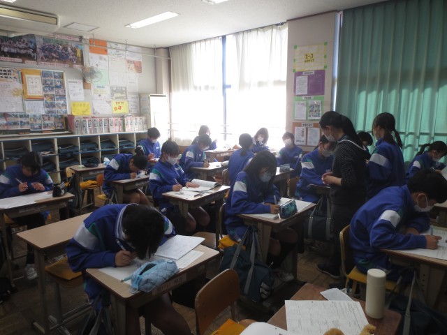 1-3数学では、テスト後の反省を行っています。生徒たちは返却された答案に向き合い、自分の解答を丁寧に確認しながら、どこでつまずいたのかを真剣に振り返っていました。