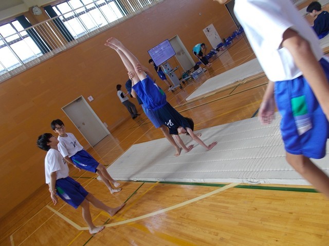 11の保体・マット運動の様子です。倒立の恐怖心を、前転することで回避し、美しい形を追求しています。