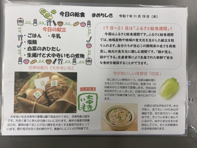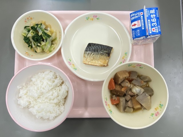 ごはん、塩鯖、生揚げと沼津特産大中寺いもの煮物、白菜のおひたし、牛乳