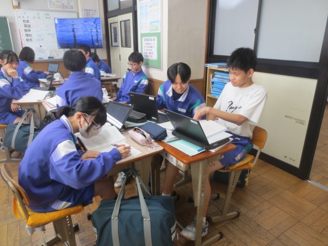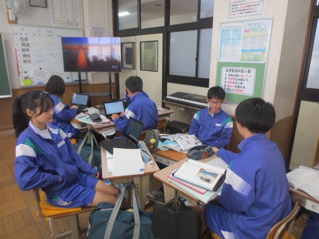 34の国語では、クロムブック、資料集等を活用し学習課題解決に向かってグループワークに取り組んでいます。