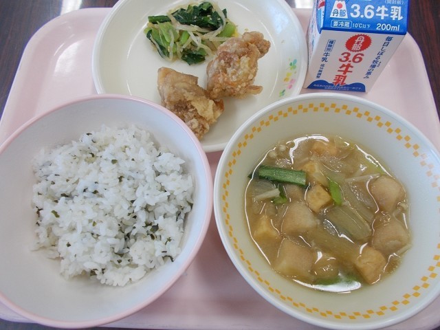 わかめ麦ごはん 牛乳 鶏肉の塩から揚げ もやしのゴマ酢和え 玉葱と生揚げの味噌汁
