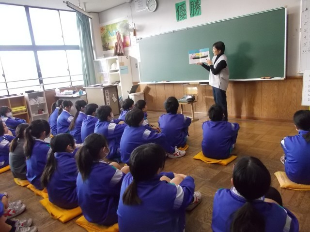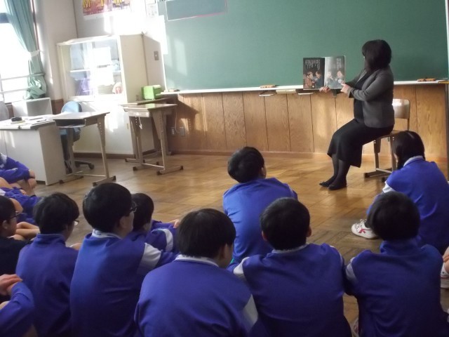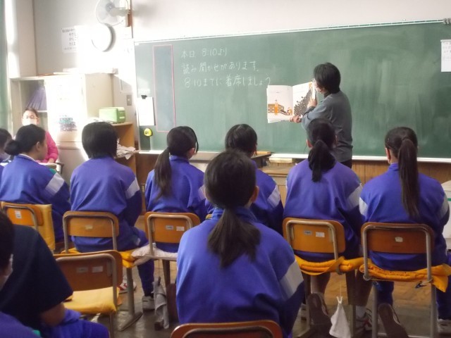 今朝は、ボランティアの皆様による「読み聞かせ」を行いました。写真は、1年生の様子です。