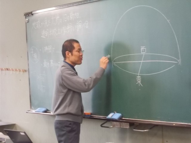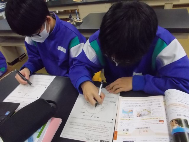 32の理科の様子です。今の時期の太陽の軌道を予測して、描いていきます。