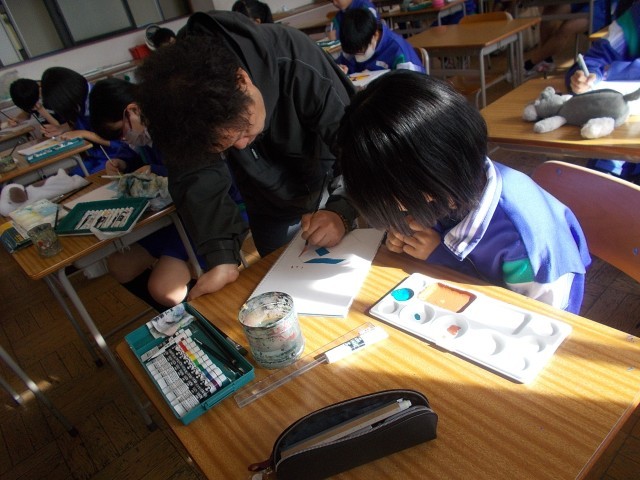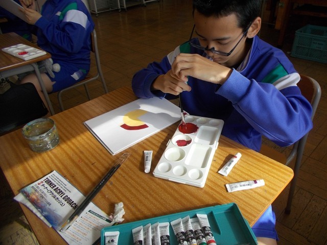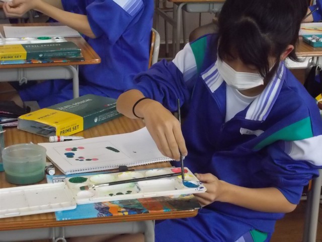 12の美術の様子です。筆づかい、色の調合に気を配り、ロゴの作製に入り込みます。
