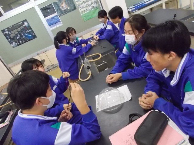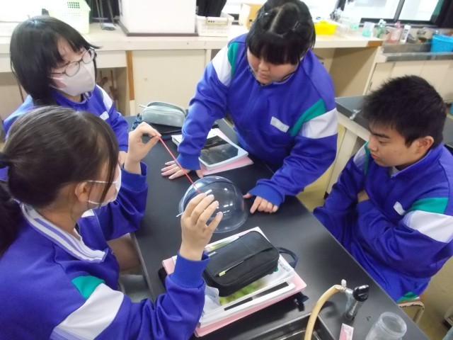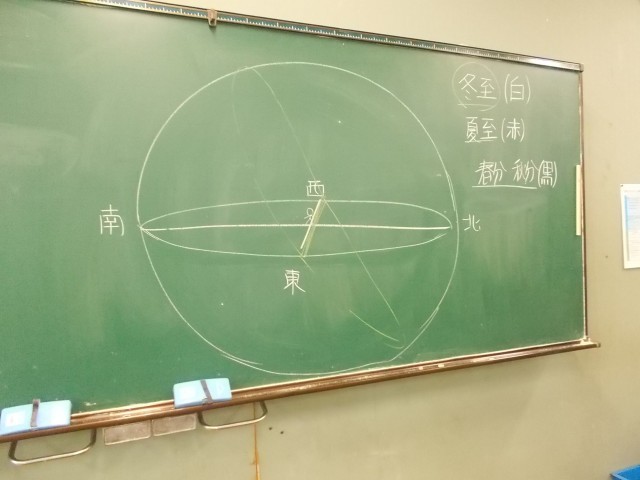 33の理科の様子です。本時は、透明の天球に夏至・冬至・春分の日・秋分の日の太陽の軌跡をテープで貼りつけ示す内容です。
