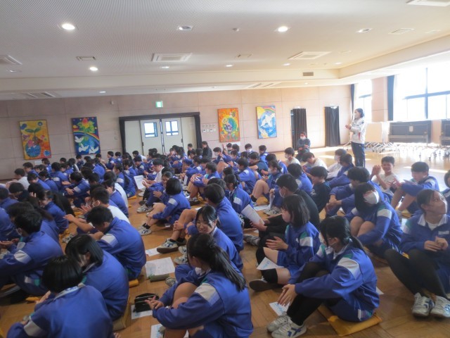 4時間目3年生学年集会では、最後に学年主任の先生からのお話がありました。自主自立という言葉とともに、残り1学期五中生として、どんな3年生になってもらいたいか、心のこもったメッセージを生徒達に送っていました。また、最後のサプライズニュースには、生徒達から大きな拍手が沸き起こりました。