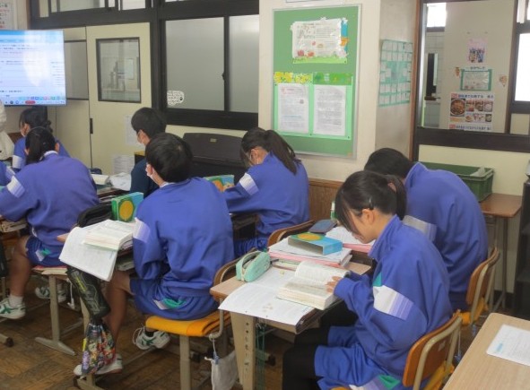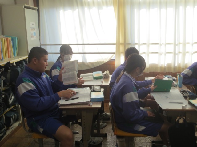 22英語では、職場体験での経験や感じたことを英語で表現しています。辞書やクロムブック等自分で取捨選択し、自分の表現したい内容を英文にしていきます。