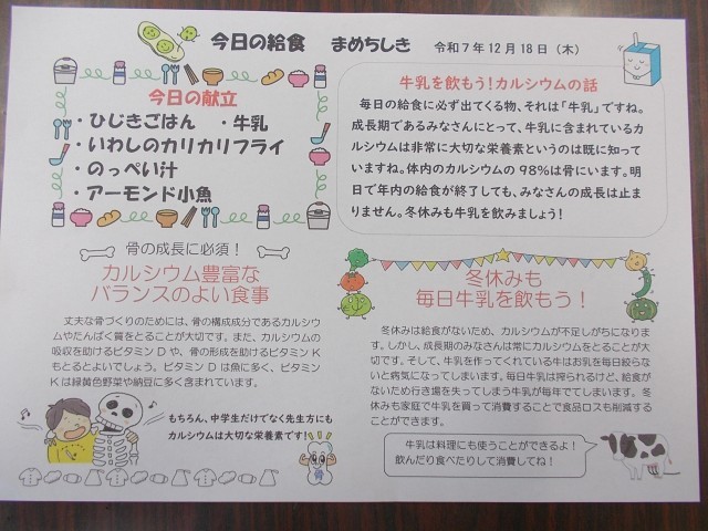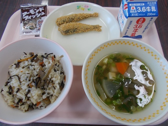 ひじきごはん 牛乳 いわしのカリカリフライ のっぺい汁 アーモンド小魚