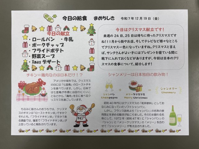 ロールパン、ポークチャップ、フライドポテト、野菜スープ、Xmasデザートです。