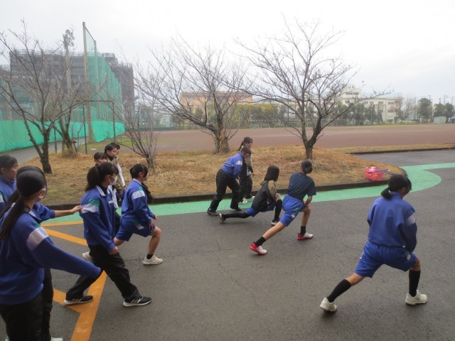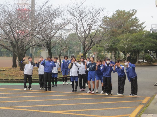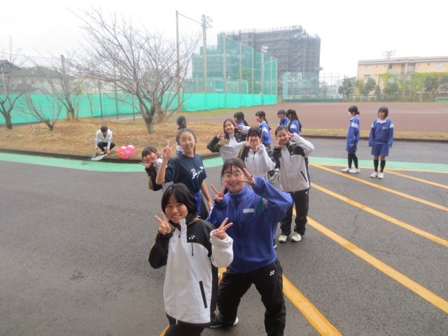 女子テニス部は、コートのコンディションが悪いため部室の清掃を行い、コートが乾くまでアップを行っています。いつも大きな声であいさつを返してくれる、元気いっぱいの女子テニス部です。