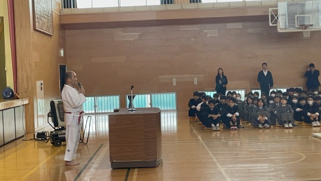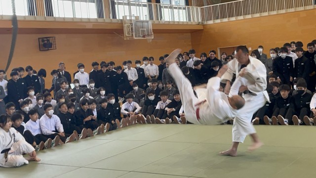 校長式辞では、校長先生自らが、全校生徒の前で柔道を披露されました。生徒たちに様々な柔道の技で投げられながら、「投げられることを恐れず、チャレンジすることの大切さ」を身をもってお話しされていました。最後には「厳冬」という詞を紹介し、春を迎えるときにどんな自分になっていたいのか、そのために今、どんな樹木として根を張るのかを考えるメッセージが送られました。厳しい冬を越えた先にある成長を思い描きながら、生徒たちはそれぞれの挑戦への一歩を心に刻んでいました。