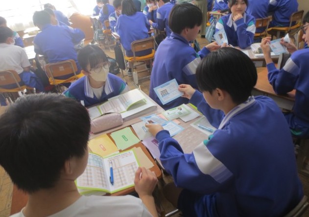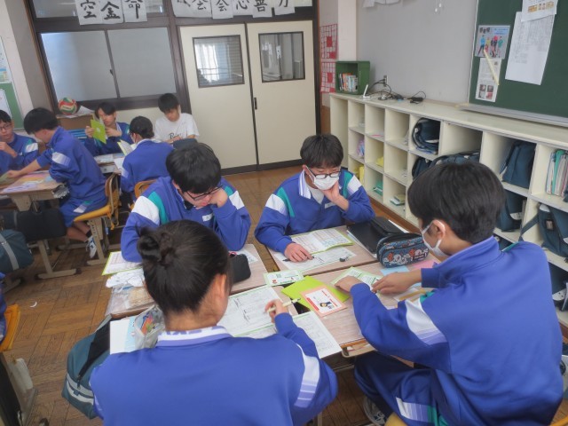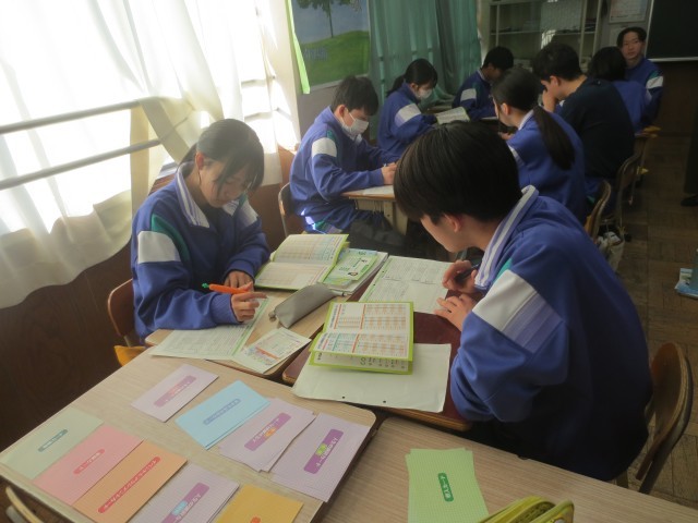 34家庭科では、マネープランカードを活用しながら将来起こるであろう出来事についてグループで考えています。