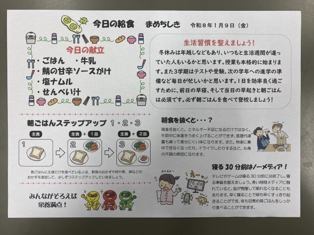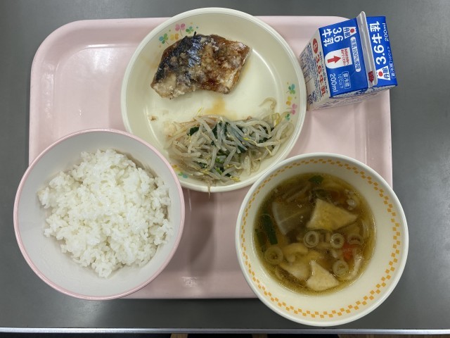 ごはん、鯖の甘辛ソースがけ、塩ナムル、せんべい汁、牛乳です。