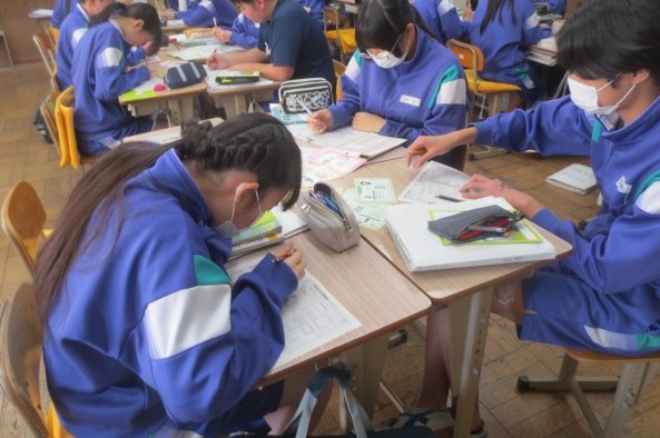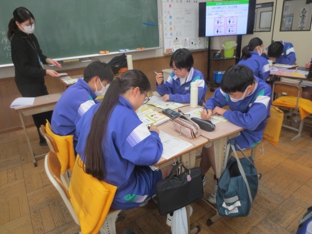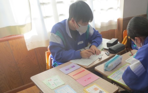 32家庭科では、マネープランカードを活用し、将来を見据えた資金のやりくりについて考える学習を行っています。学習では、働く世代になったときに想定されるさまざまなライフイベントを取り上げ、それに伴う支出や備えについて、グループで意見を出し合いました。