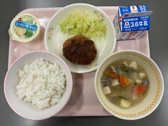 麦ご飯、ソースとんかつ、ボイルドキャベツ、豚汁、シークワーサーゼリー、牛乳