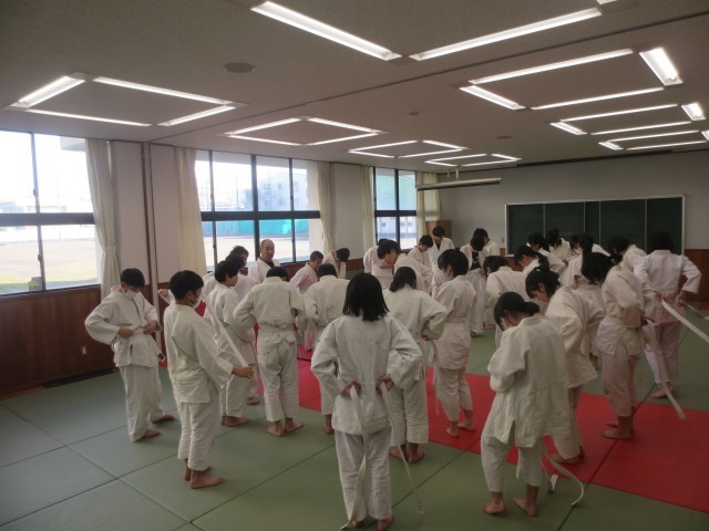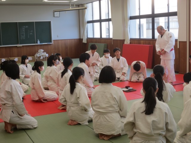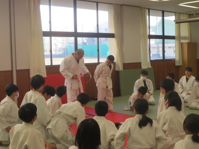 14体育では、柔道の授業に向けて、校長先生から、柔道着の胴帯の締め方について説明をしていただきました。胴帯の正しい位置を中心に、実際に柔道着を着用しながら、「どの位置で帯を締めるのがよいのか」実演を交えながら丁寧に説明していただきました。