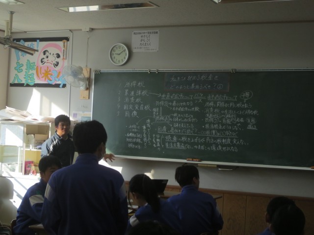 34の社会では、税の仕組みの一つである「累進課税」について学習しています。授業では、所得に応じて税率が変わる累進課税の仕組みについて、「なぜこのような制度があるのか」「公平な制度と言えるのか」といった視点から、それぞれの考えを出し合いました。