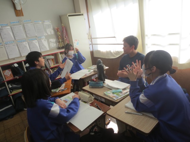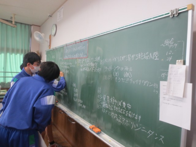 14社会では、「オセアニア(オーストラリア)のキャッチフレーズを作ろう」という学習課題に対して、班でオーストラリアのキーワードと共に心に残るフレーズを考えています。