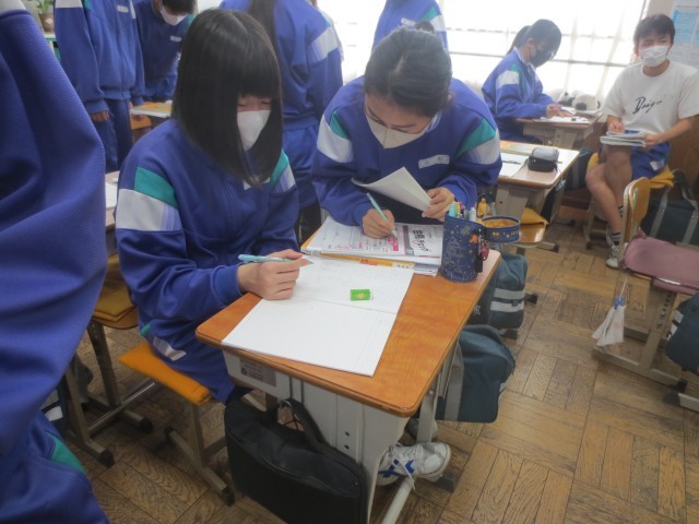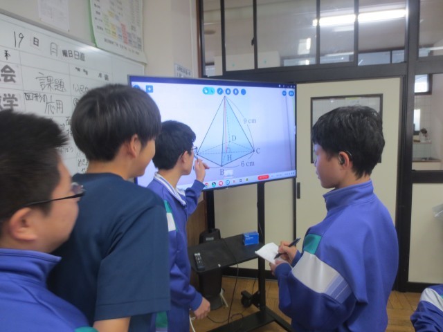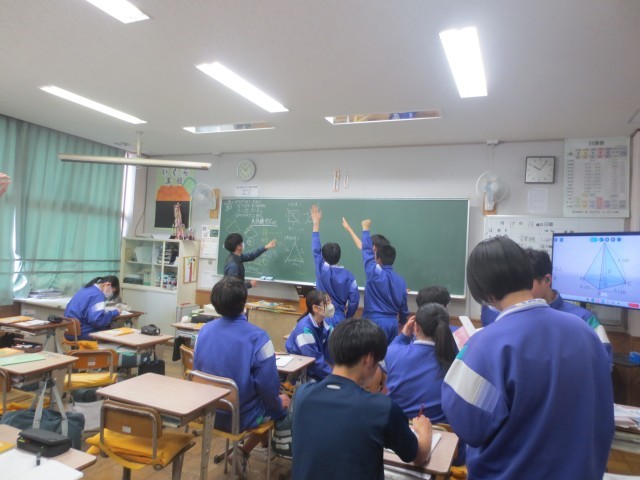 31数学では、体積と表面積の学習をしています。黒板で説明してくれる人という声かけに、すぐにたくさんの手が挙がり、「やりたい」「説明したい」という声が教室のあちこちから聞こえてきました。