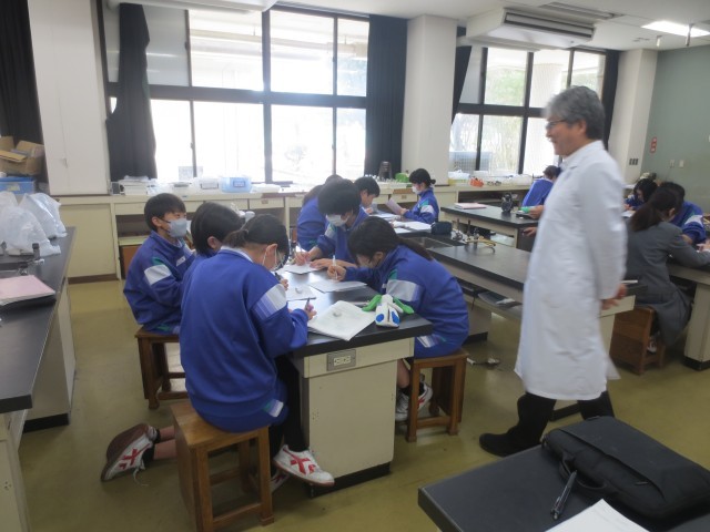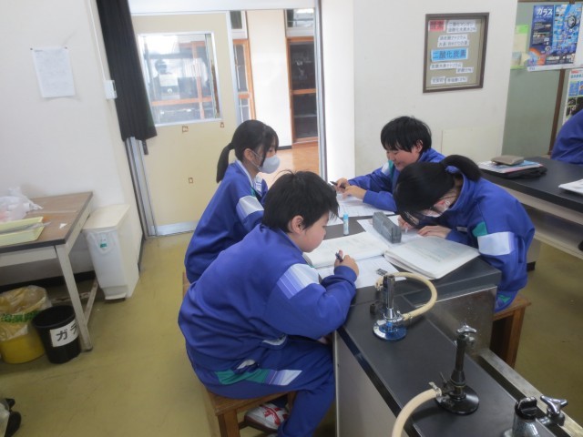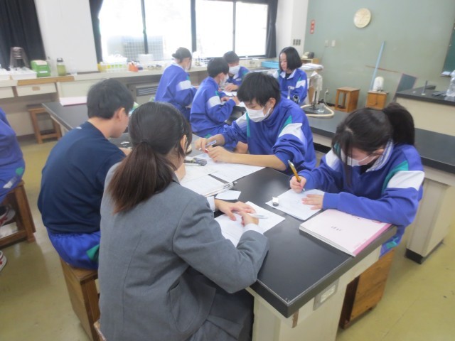 12理科では、力について学習をしています。自分の考えを言葉や図で表し、グループで意見を交流しながら学びを深めていました。
