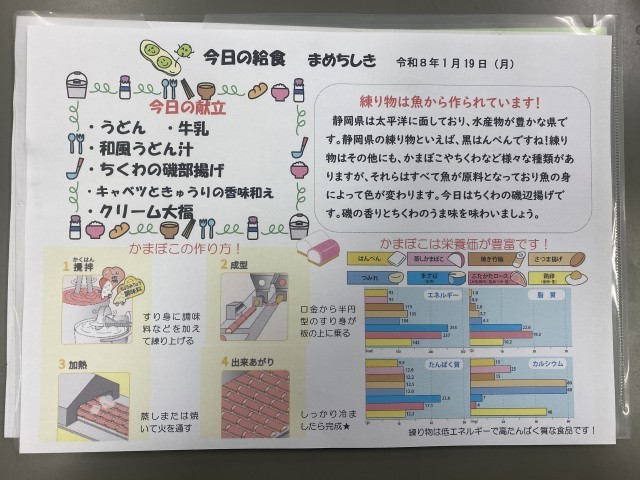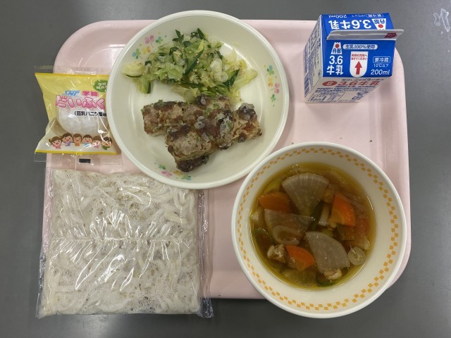 うどん、和風うどん汁、ちくわの磯部揚げ、キャベツときゅうりの香味和え、クリーム大福、牛乳です。