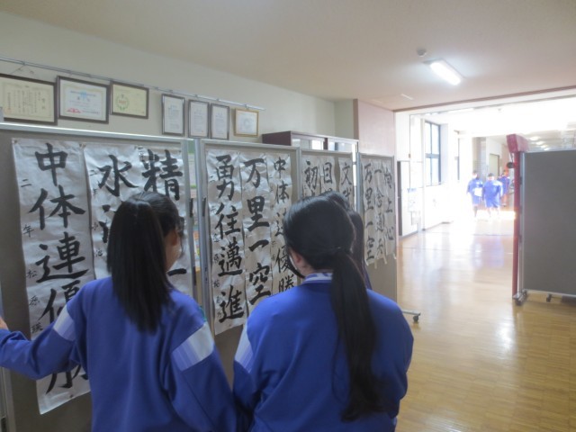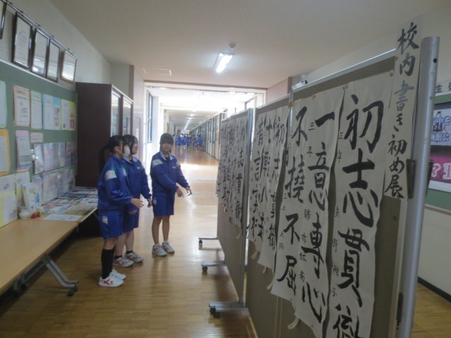冬休みの宿題で行った書き初めの中から、各学年で選ばれた作品が職員室前に掲示されています。今年は、自分が書きたい言葉を選び書にしました。作品には、生徒一人一人の思いや目標が表れており、休み時間には足を止めて見入る姿も見られました。